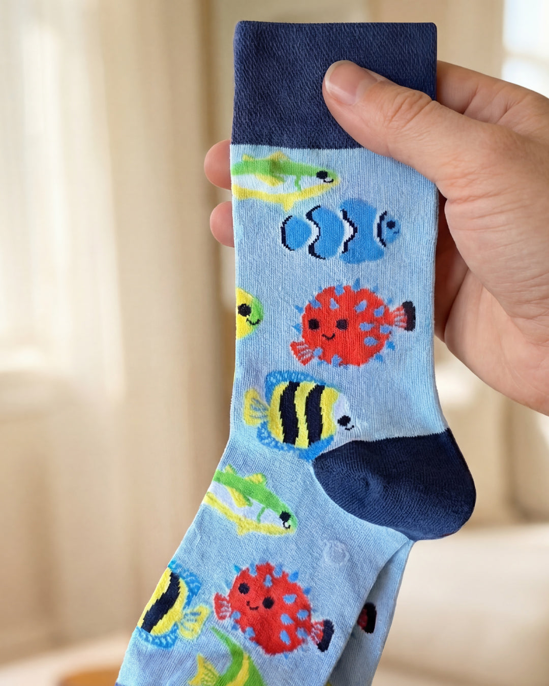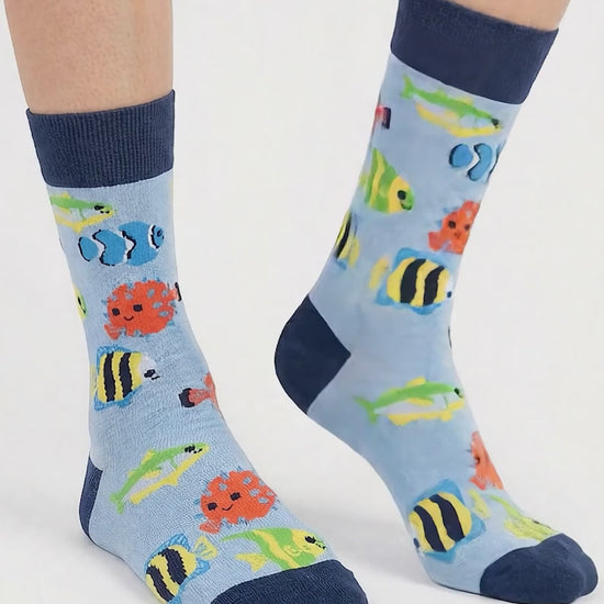 Step into a colorful underwater world! Our fish-themed socks feature cute fish patterns in vibrant colors, offering a fun, energetic, and cheerful style. The underwater figures on the light blue background create a fresh and pleasant look with every step.