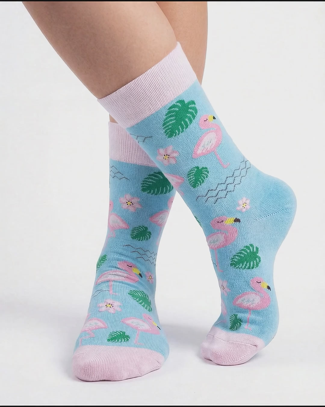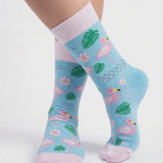 Bring summer energy to your steps! Our flamingo-themed socks add a cheerful and fresh touch to your style with elegant flamingo, tropical leaf, and flower patterns on a cool blue background. With their vibrant colors and fun design, these socks bring a summer vibe to your everyday outfits.