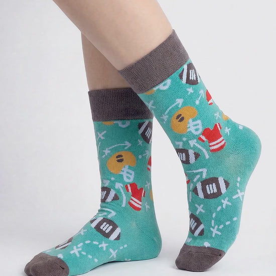 Step Up Your Game! Bring the excitement of the match to your feet! Our American Football-patterned socks combine comfort and fun. With eye-catching helmets and tactical play sketches on a green pitch background, these socks will be your favourite accessory.