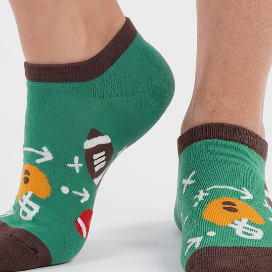 Step Up Your Game! Bring the excitement of the match to your feet! Our American Football-patterned socks combine comfort and fun. With eye-catching helmets and tactical play sketches on a green pitch background, these socks will be your favourite accessory.